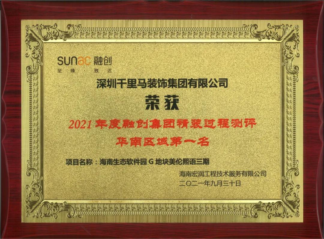 千里馬裝飾集團(tuán):融創(chuàng)美倫熙語項(xiàng)目榮獲“2021年度融創(chuàng)集團(tuán)精裝過程測評華南區(qū)域第一名”