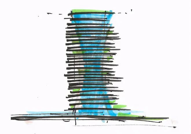字節跳動后海中心由Ennead操刀設計,建筑方案將為這一高科技巨頭提供一個靈活、獨特且生動的工作環境。建筑師從韻律跳動的字節Logo中獲得靈感,將單體建筑通過分層式解構,形成建筑節奏,并在立面上形成一個個交流中心。高效的中央核心筒作為主體結構,在中間邏輯與工具的支持下,提供給人們交流、探索與協作的平臺。