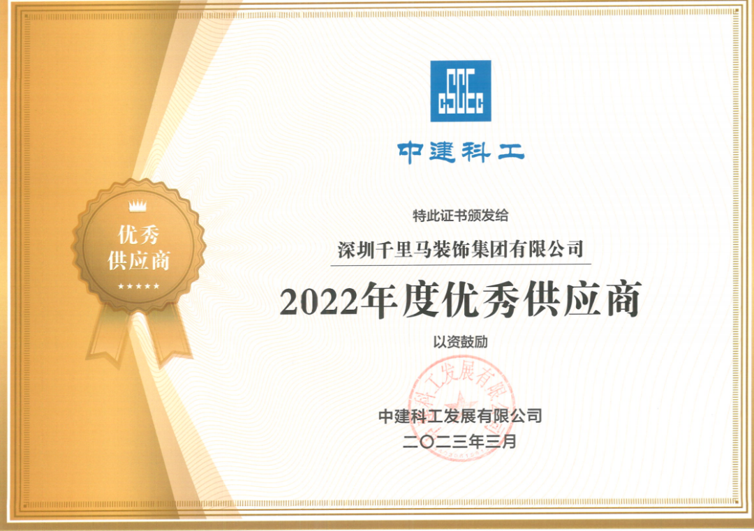 深圳千里馬裝飾集團:榮獲中建科工“優秀供應商”稱號