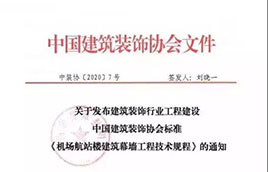 2020年3月12日,由深裝總建設集團股份有限公司(以下稱“深裝總”)主編,中國建筑西南設計研究院、中國建材檢驗認證集團、 蘇州廣林、蘇州金螳螂、深圳寶鷹、北京港源、上海藍天等26家行業領先單位共同參與編制的《機場航站樓建筑幕墻工程技術規程》 T/CBDA 37-2020經中裝協【2020】7號文件正式批準發布,自2020年7月1日起實施。