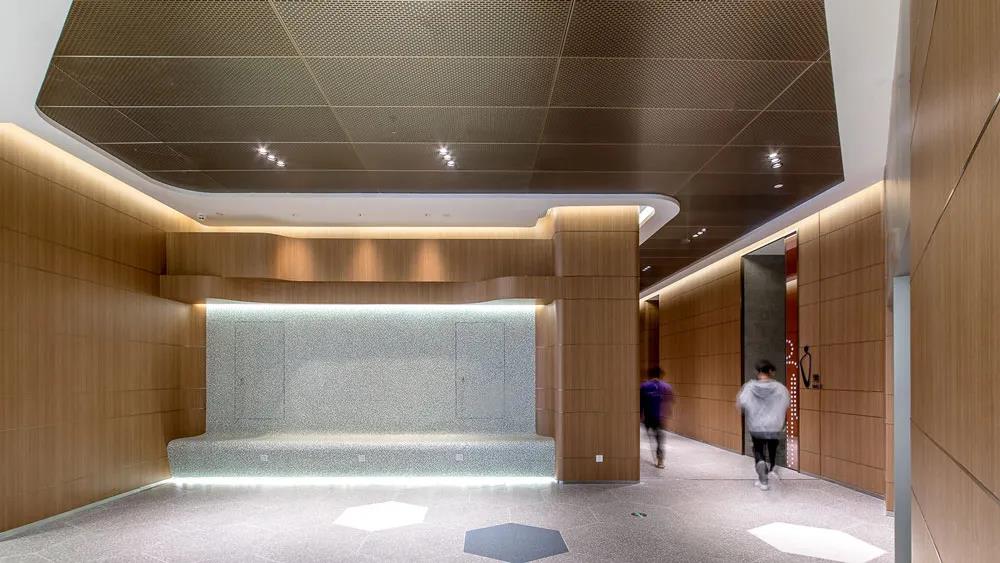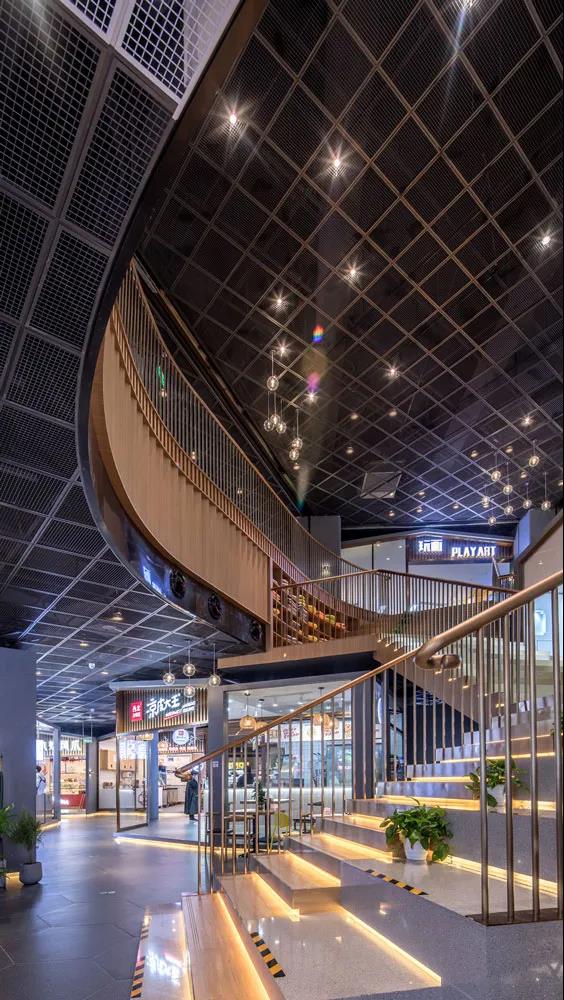 商業(yè)入口的設(shè)計更是整個項目的吸睛之處,天花的造型向外延伸,以此模糊室內(nèi)外的界限,天花的造型提取于一棵枝繁葉茂的大樹向四周生長蔓延。