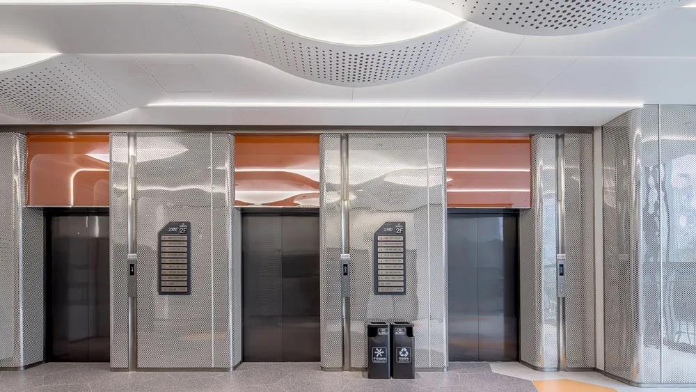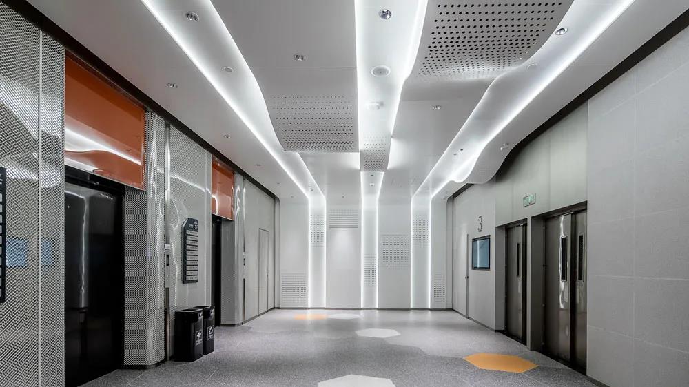 在次要空間中,衛(wèi)生間和電梯廳都延續(xù)了生長的概念,通過現(xiàn)代時尚的弧形邊角處理,形成一種微妙的科技感,局部點(diǎn)綴的色彩,使空間增加了年輕的氛圍。