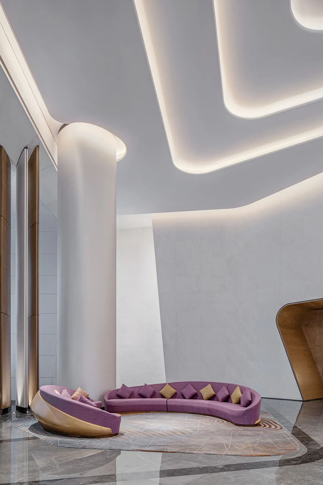 凝視是一種無意識的觸摸。與皇冠假日酒店的第一次對視,你會讀取到清晰的輪廓、升騰的秩序和流暢的線面結構。進入大堂,均質的釉白從穹頂蔓延,蕩出層層硬朗漣漪,向下勻速流動,圍合成弧形墻體,曲面廊梯。