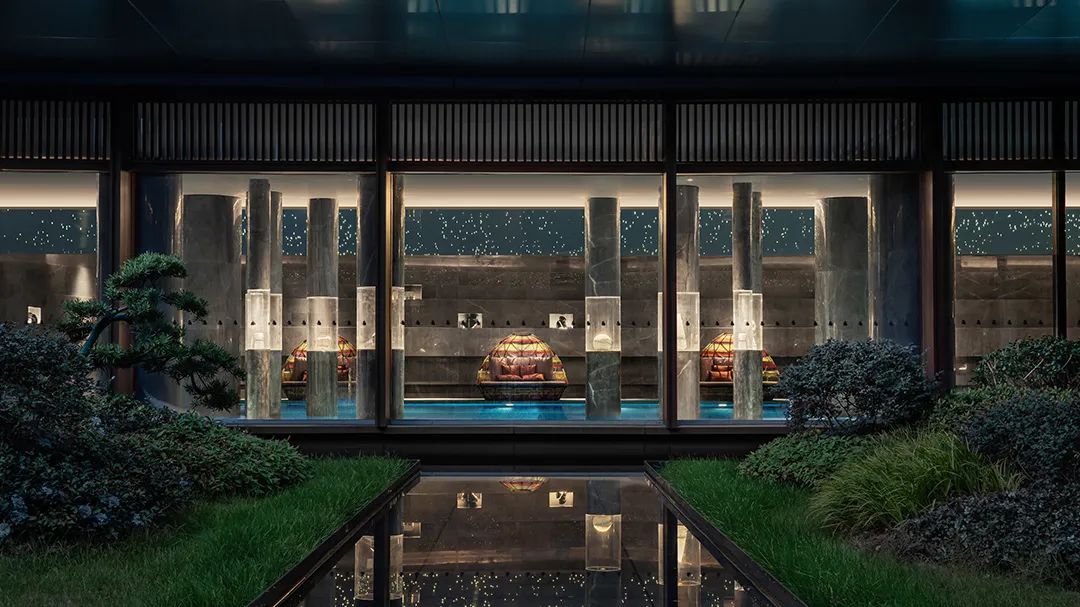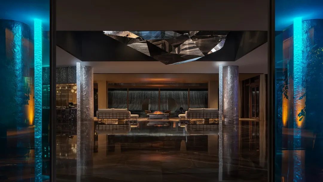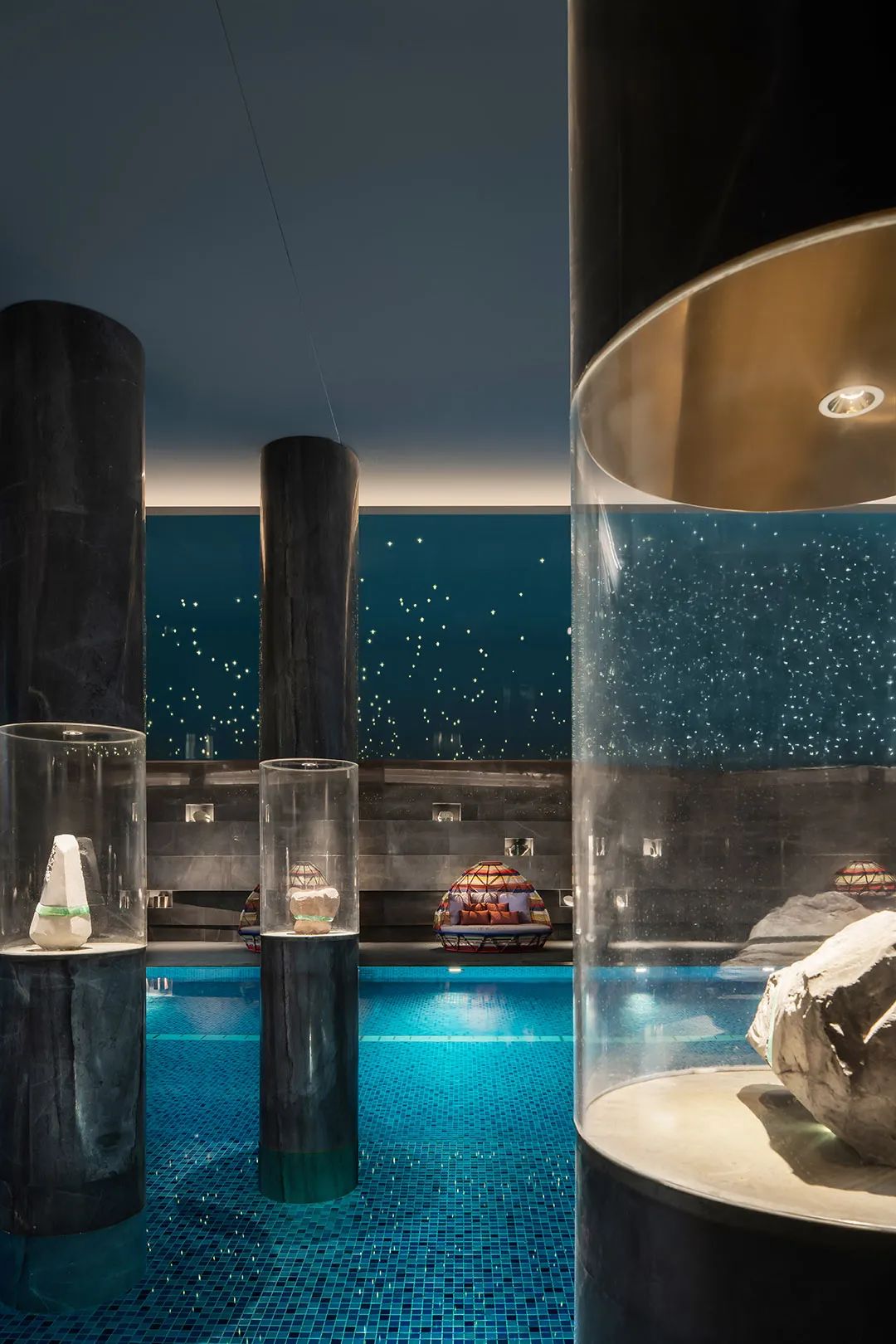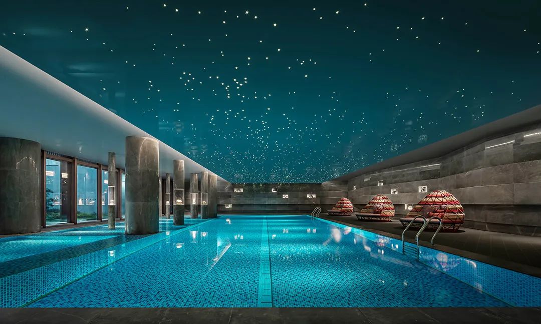 就連泳池,也懸垂銀河天象,珍藏著不同地質年代的礦物標本。層層堆疊的地幔環繞,如置身幽深礦谷。星光傾瀉,鑿空這片深邃的昏暗。
