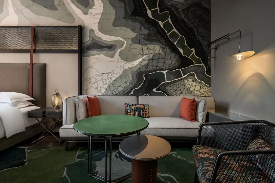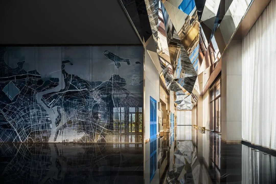 當大地側了個身,將山河走向、地質肌理坦露于墻,送來城市生長變遷的信息,你會不自覺沉迷靜思。常規的宴會電梯廳前,YANG別出心裁引入地形圖譜,激發驚喜。