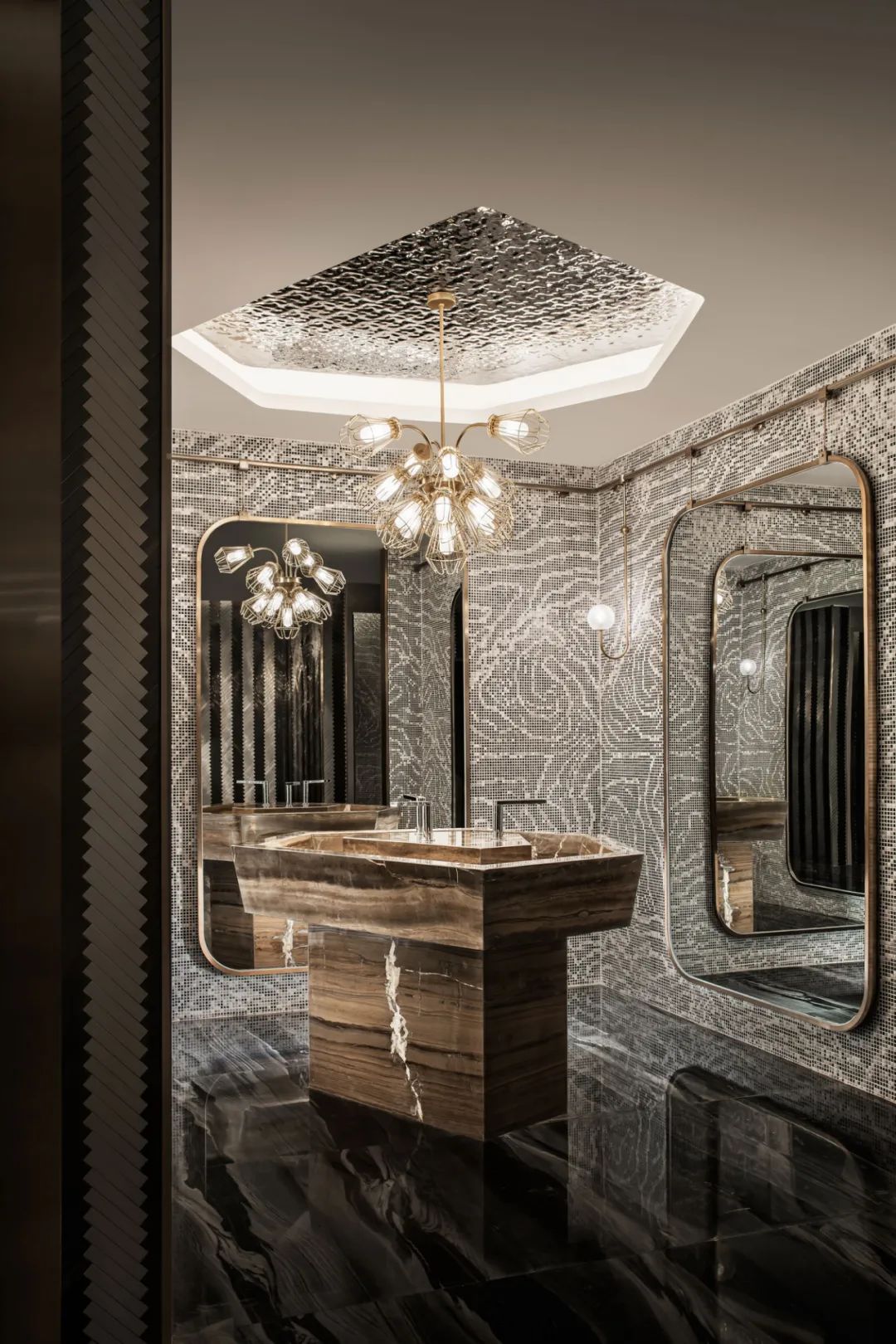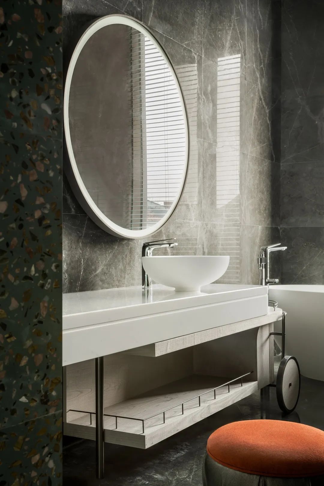 礦巖結構的洗手臺、地形紋理的馬賽克墻設計連續且細密