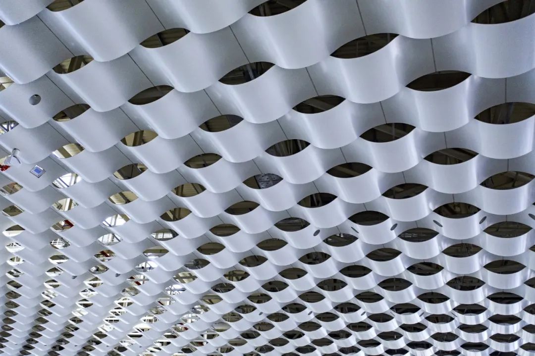 整個(gè)主登錄廳最具特色的當(dāng)屬那50米高空處由1976塊波浪形蜂窩鋁板組成的波浪吊頂。因此,主登錄廳成為了整個(gè)項(xiàng)目精裝修工程中高空頂面最大、施工難度最大、工藝最復(fù)雜的標(biāo)段。