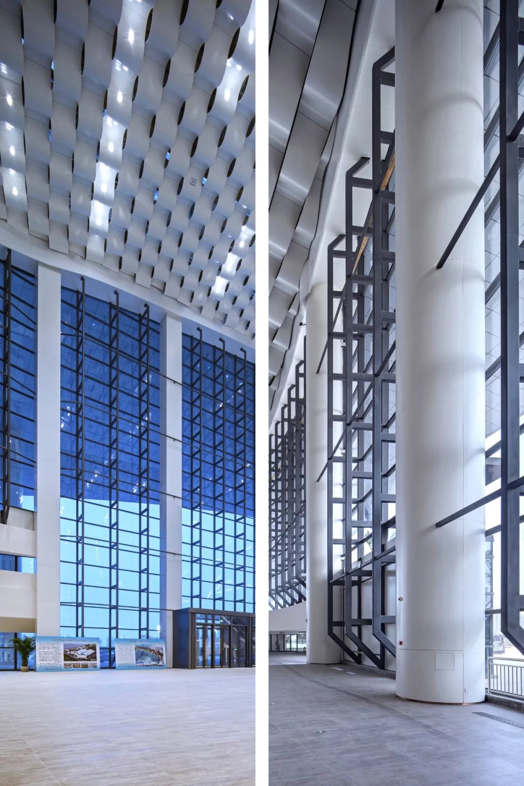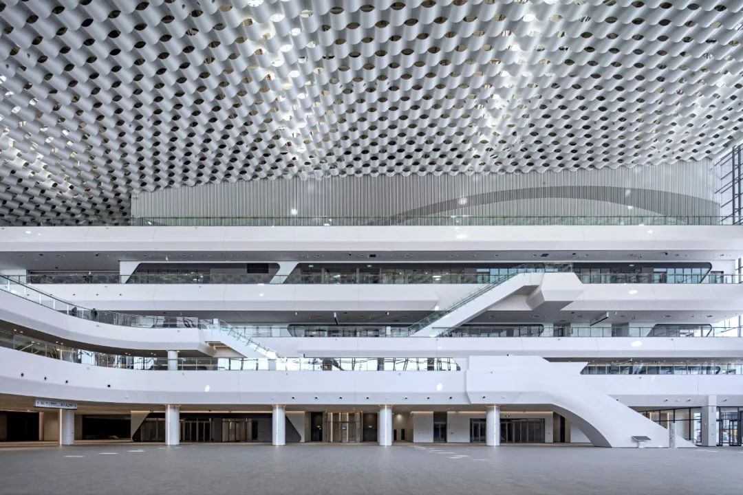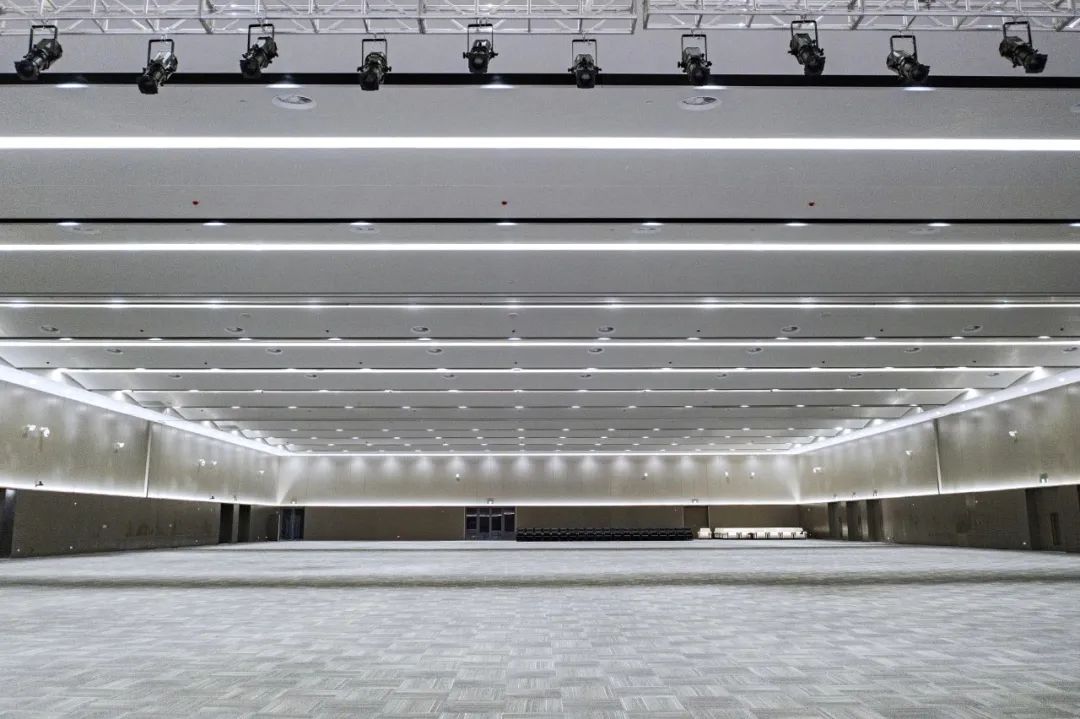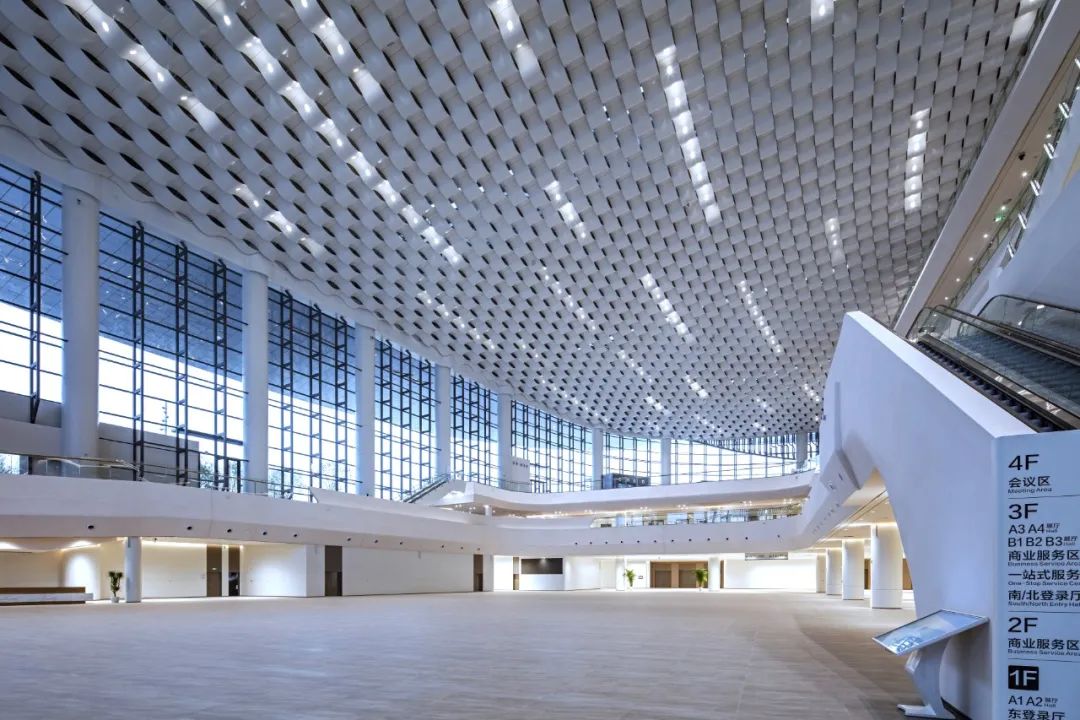 走進(jìn)門廳,一股簡潔明快、清新大方的現(xiàn)代之風(fēng)撲面而來。站在高大寬闊的大廳前,人顯得如此渺小。放眼望去,無論是那充滿海浪流動(dòng)感的四層樓裙,還是那連綿起伏、波瀾涌動(dòng)的波浪形吊頂,亦或是那鑲嵌在波浪之中宛如明珠般的點(diǎn)點(diǎn)燈光,都讓人有一種身臨浩瀚大海之感。主登錄廳也是整個(gè)會(huì)展中心最具特色、最核心、最重要的區(qū)域之一。