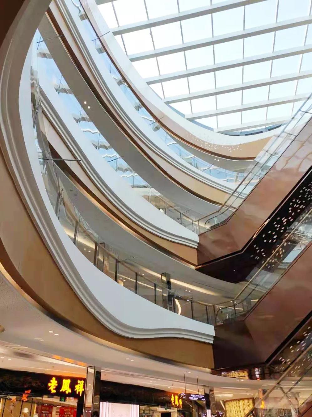 江海廣場是江海區(qū)首個大型商業(yè)綜合體。為了增加江海的地域特色,江海廣場以“魚躍龍門·海洋·衣錦還鄉(xiāng)”為主要空間設計概念,在縱向空間打造“起航、相遇、財富”三大主題情景中庭。設計師將鯉鱗、水、絲綢三大代表性物品進行提煉,具化為立體、多維的形、線、色,運用于中庭側部。曲線的廣泛應用大大增加了項目的施工難度,卓藝裝飾精益求精,運用各種手段,精準測量、精心裁切、精心打造各種曲面造型,達到了項目預期的設計效果。