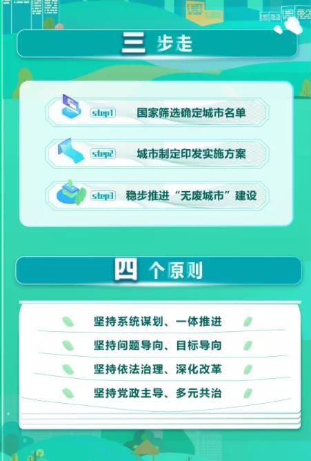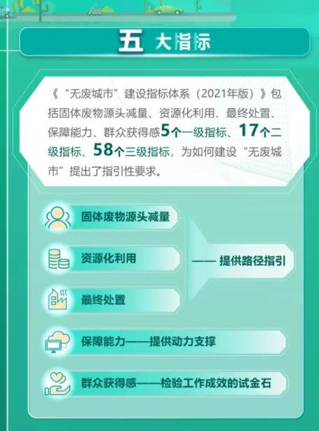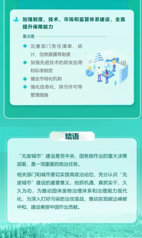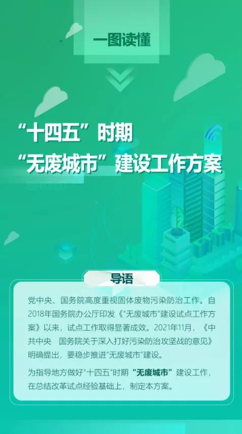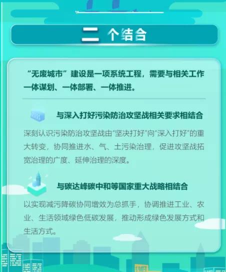 其中要求,科學編制實施方案,強化頂層設計引領。將“無廢城市”建設目標任務納入城市或區域國民經濟和社會發展“十四五”規劃及生態環境保護規劃等相關專項規劃。因地制宜編制“無廢城市”建設實施方案,與深入打好污染防治攻堅戰相關要求、碳達峰碳中和等國家重大戰略以及城市建設管理有機融合,明確任務措施,一體謀劃、一體部署、一體推進。建立完善“無廢城市”建設評估機制,推動將建設成效納入當地黨委、政府績效考核。同時,統籌市域范圍內固體廢物利用處置設施布局,鼓勵跨區域合作,加強設施共建共享。將生活垃圾、市政污泥、建筑垃圾、再生資源、工業固體廢物、農業固體廢物、危險廢物、醫療廢物等固體廢物分類收集及無害化處置設施納入環境基礎設施和公共設施范圍,保障設施用地和資金投入。構建集污水、垃圾、固體廢物、危險廢物、醫療廢物處理處置設施和監測監管能力于一體的環境基礎設施體系,形成由城市向建制鎮和鄉村延伸覆蓋的環境基礎設施網絡。
