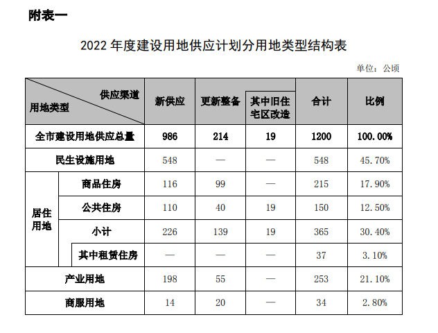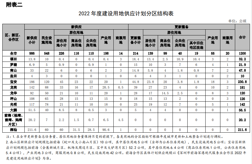 根據計劃,2022年度全市(含深汕,下同)計劃供應建設用地1200公頃(詳見附表 1、2),其中新供應建設用地986公頃,更新整備供應建設用地214公頃(含舊住宅區改造供應居住用地19公頃)。具體來看,民生設施用地 548公頃,居住用地365公頃,產業用地253公頃,商服用地34公頃。