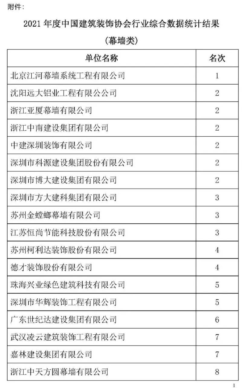 根據中裝協《關于開展2021年度中國建筑裝飾協會行業綜合數據統計工作的通知》(中裝協 [2022]24號文件)及文件中所確定的工作原則和統計規則, 中國建筑裝飾協會組織開展了2021年度中國建筑裝飾行業綜合數據統計工作,此次綜合數據統計工作分為裝飾、幕墻、設計、建材四類,現將2021年度中國建筑裝飾協會行業綜合數據統計幕墻類結果名單予以公示,公示期7天。